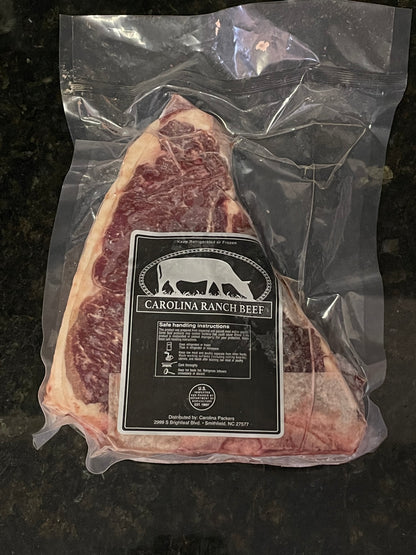 This is a big ole thick cut T-BONE Steak! Our Black Angus Cattle are pasture raised, grass fed, and born and raised in Clayton, NC! The Grass Fed Beef T-BONE Steak includes both the Filet Mignon and NY Strip, separated by a bone. It is priced at $22.99/lb